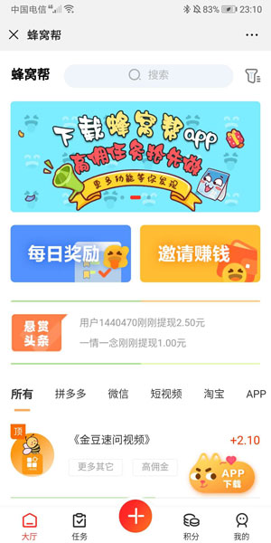 蜂窝帮 分类:数字金融 大小:5.07 MB 开发者:重庆夭夭网络科技有限公司下载次数:3256最新版本:1.0.12热度: 作者: 发布: 2020-03-14 10:01:52 支持: 安卓苹果 Tags: 安卓下载 APP截图 应用介绍 蜂窝帮,让您的闲暇时间变得更有价值。蜂窝帮APP是一款手机悬赏任务平台,悬赏、互助,帮人忙就能赚钱!用户在这里,不仅可以通过完成悬赏任务来赚佣金,还可以发布任务供其他用户完成。海量悬赏任务,让你的业余时间变得更有价值! 【平台特点】 最新应用 蜂窝帮 钱帮 截图宝 撸猫有财